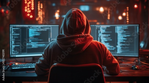 A person cloaked in a hoodie focuses intently on multiple computer monitors displaying complex code. The dim, ambient lighting enhances the atmosphere, highlighting the tech-heavy workspace late at ni