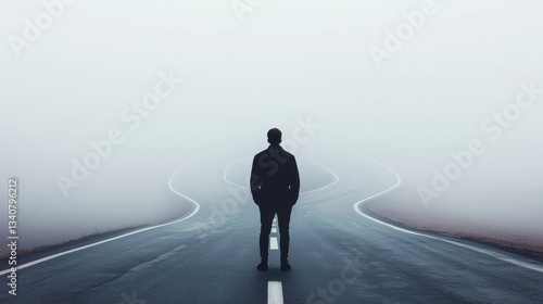 A person standing alone on a foggy road, contemplating a difficult decision ahead.