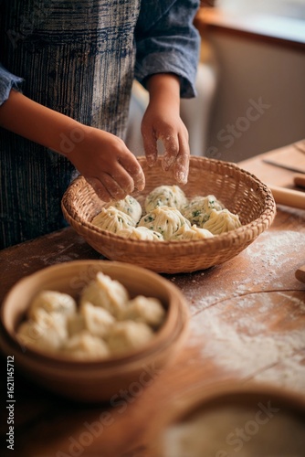 A person with hands covered in flour skillfully shapes dough balls in a woven basket. The kitchen has a warm atmosphere, showcasing homemade cooking