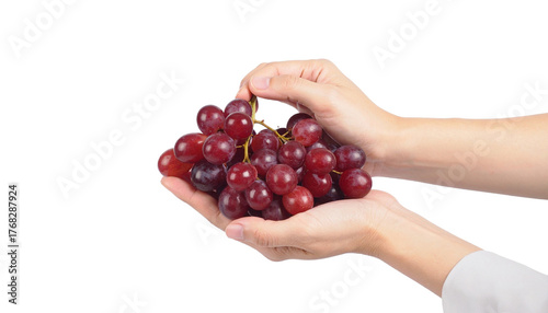 A person's hands delicately hold a vibrant cluster of ripe, juicy red grapes. A visual representation of natural freshness and the pleasure of enjoying nature's bounty