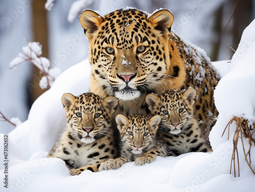 A Photo of a Jaguar and Her Babies in a Winter Setting