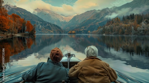 A photograph of two elderly people enjoying a boat ride on a serene lake, with mountains and trees reflected in the water. Ultra detailed