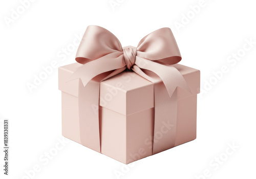 A photorealistic pale blush pink matte luxury square gift box, sharp focus on the voluminous reflective satin ribbon bow, transparent background. Concept of celebratory elegance