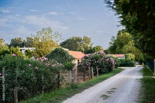 A picturesque rural road with lush oleander bushes and cozy houses in Stoj Montenegro. An idyllic countryside scene on a sunny day