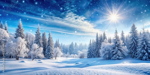 A picturesque winter wonderland scene with snow-covered trees, a brilliant sun shining through a cloud-streaked sky, and a tranquil snow-covered forest floor.