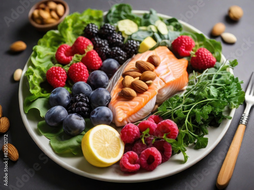 A plate filled with kidney-friendly foods, such as leafy greens, berries, fish, and nuts, highlighting the role of nutrition in maintaining kidney health. with Generative AI Technology