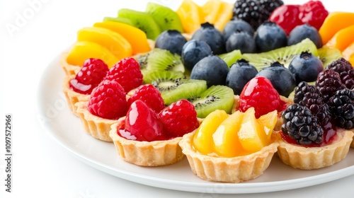 A plate of colorful fruit tartlets with assorted berries and kiwi slices, Each tartlet's vibrant colors and sweet fillings captured with precision