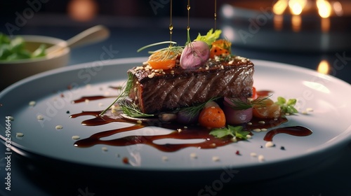 plate, food, cookery, meat, dish, garnish, culinary arts, steak, indoor, eatery, plant, sauce, dinner, meal, beef, pork meat, grilled, epicure, vegetable, salad, roasted, red, roast, tomatoes, lamb, delicious, lunch, fillet, cooked, white
