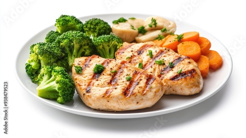 A plate of grilled chicken with steamed broccoli and carrots on a white background, with space for promotional content.