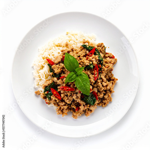 a plate of stir fried dish is presented on a white plate, set against a white background. the stir fry, featuring ground meat, is punctuated with green leaves and sliced red chili peppers