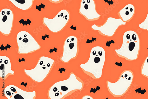 A playful pattern of various cartoon ghosts with expressive faces on a background. The ghosts have wide eyes and open mouths, evoking surprise or fright. Ideal for Halloween designs