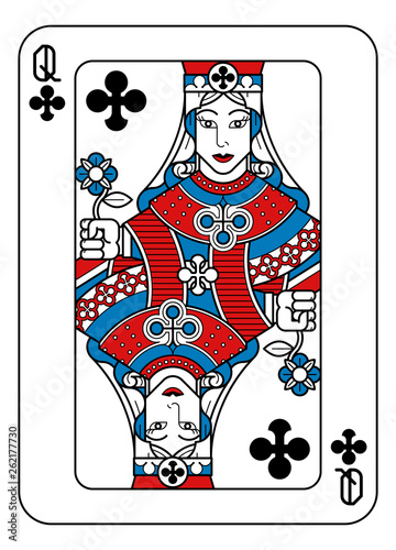 A playing card Queen of Clubs in red, blue and black from a new modern original complete full deck design. Standard poker size.
