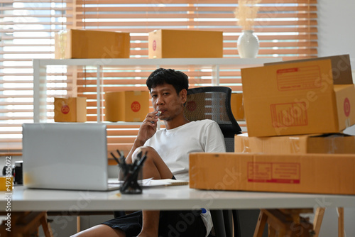 A portrait of a male employee with casual outfits sitting in home office full of parcels taking a break and sitting relaxed, for SME, start up, delivery and e-commerce business concept.