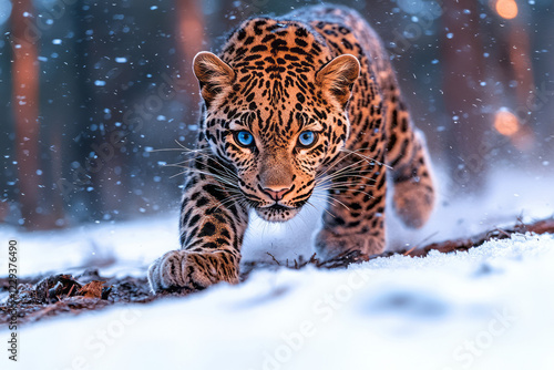 A rare Amur leopard stealthily moving through a snowy forest, highlighting its elusive nature and the importance of preserving its dwindling habitat,