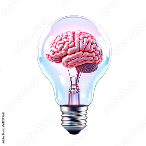 A realistic 3d render of a human brain inside a clear glass lightbulb, symbolizing ideas, intelligence, and innovation, isolated on a transparent background