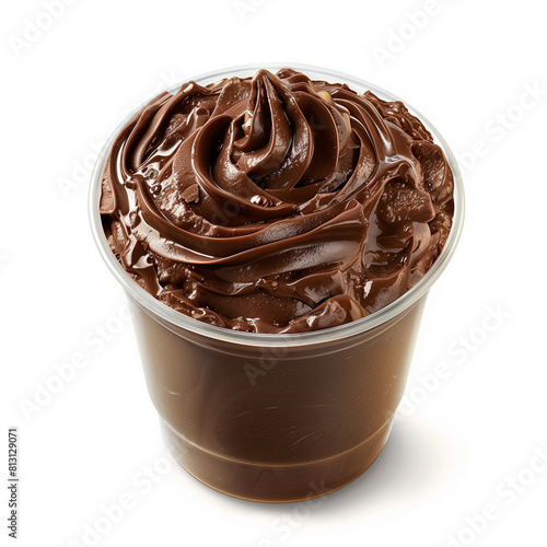 A realistic photo of dark chocolate cream in transparent plastic cup, white background, high resolution photography