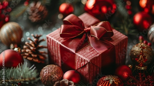 A red box with a red ribbon sits on a table with many red and gold ornaments