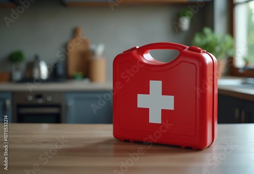 A red first aid kit with a white cross on top is on a kitchen counter with a blurred kitchen background