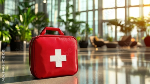 first aid kit, first aid, kit, red, white, cross, medicals, emergency, health, health care, bag, medicine, treatment, help, care, equipment, safety, travel, hospital, clinic, doctor, nurse, wellness, injury, accident, aid, medical supplies, container, baggage, preparedness, supply, indoor, lobby, bright, modern, plant, furniture, background, interior, nobody, office, workplace, corporate, urgent, support