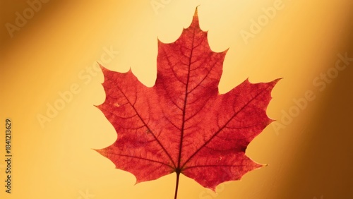 A red maple leaf against a warm yellow background, with clear veins showing the rich texture of autumn plants.