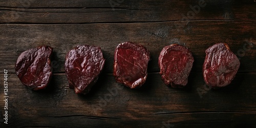 A richly marbled steak rests atop an aged wooden surface; its deep brown tones highlight the perfect sear and intricate textures