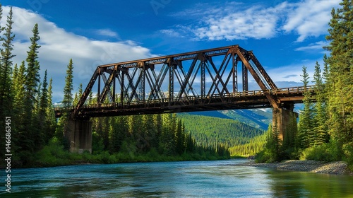 A robust steel railway bridge crossing a river, its solid beams and tracks blending with the natural surroundings of forested banks.