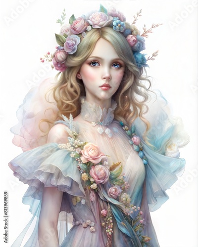 A romantic girl enchants audiences with her ethereal beauty and dreamy fashion aesthetic, adorned in delicate lace, flowing fabrics, and floral embellishments against a soft white background