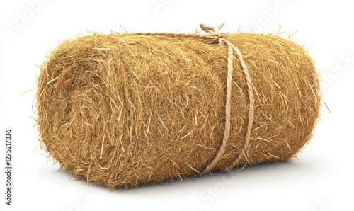 A round hay bale tied with twine, set against a plain white background, ideal for agricultural themes