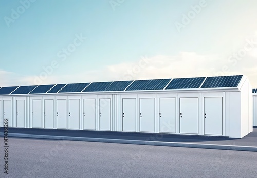 white, solar, panel, roof, blue, sky, cloud, pavement, door, horizontal, line, clean, modern, storage, facility, industrial, metal, ventilation, rectangular, neat, organised, array, corrugated, structure, panel, installation, renewable, technology, environmental, utility, grid, alignment, contemporary, modular, urban, commercial, space, management, security, access, ventilated