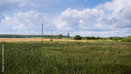 A rural scene with water tower on the background shot in the summer
