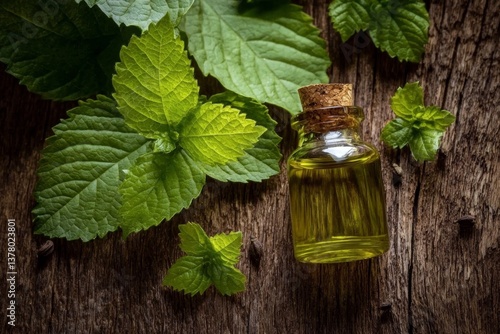 A rustic wooden table showcases the beauty of patchouli's natural essence.