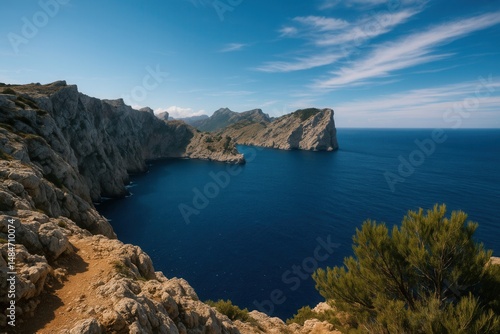 A scenic view of rugged coastal cliffs meeting the deep blue ocean, with green foliage and mountains in the distance
