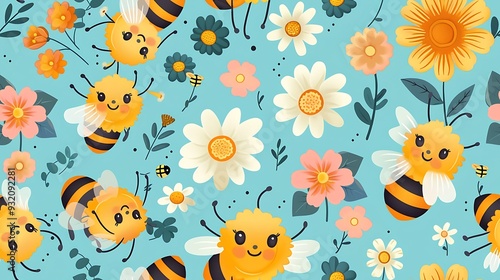 A seamless pattern of adorable cartoon bees hovering over blooming daisies and clover, with honeycombs in the background, bright and cheerful colors, detailed textures, soft lighting, hd quality,