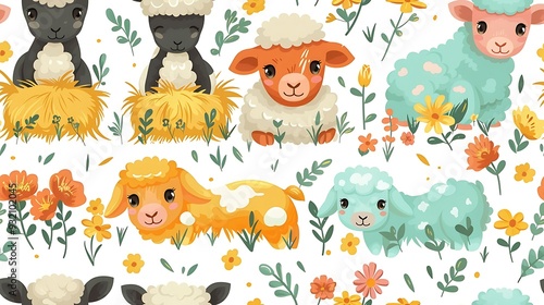 sheep, cow, playing, barnyard, hayrick, red, barn, warm, earthy, tone, fur, texture, hd, quality, natural, look, cartoon, seamless, pattern, tile, cute, adorable, farm, animal, nature, environment, vibrant, detailed, scene, playful, scenery