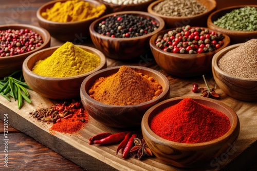 A selection of various colorful spices on a wooden table in bowls