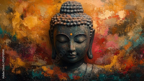 A serene Buddha statue's head features prominently against a vibrant, abstract, and colorful background, perfect for spiritual, meditation, or wellness-themed projects,