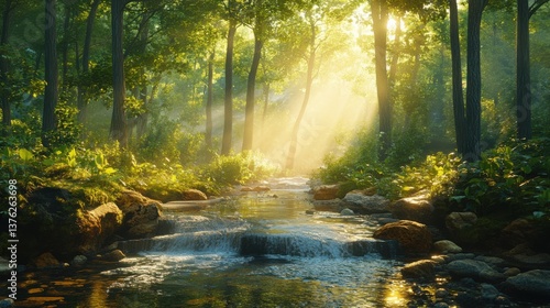 A serene forest scene with sunlight filtering through trees, illuminating a gentle stream surrounded by lush greenery.