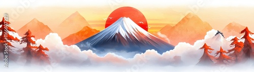 mountain, sunset, landscape, nature, cloud, serenity, calmness, zen, iconic, harmony, majestic, exploration, wilderness, peaceful, peak, vibrant, japan, skyline, stunning, heritage, hiking, relaxation, journey, horizon, silhouette, colours, artistic, scenery, calm, picturesque, sunlight, foliage, tree, art, epic, outdoors, colourful, beauty, adventure, environment, travel, culture, view, autumn