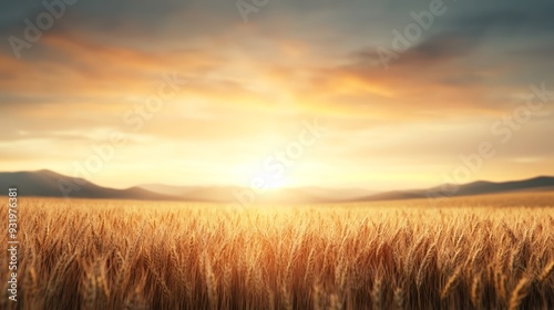 A serene landscape showcasing golden wheat fields under a vibrant sunset sky, perfect for nature and agricultural themes.