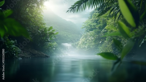 A serene, misty river flows through a lush, green jungle, illuminated by soft sunlight filtering through the leaves.
