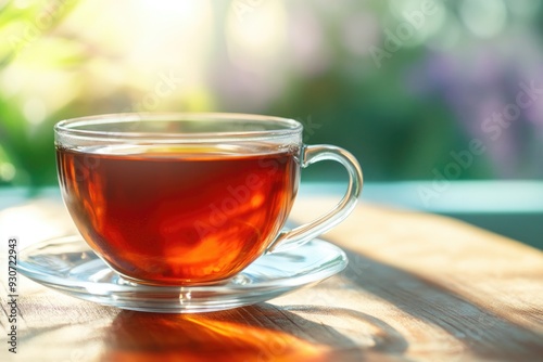 A Serene Setting on a Rustic Wooden Table with a Cup of Tea in Sunlight - Perfect for Calm and Relaxation