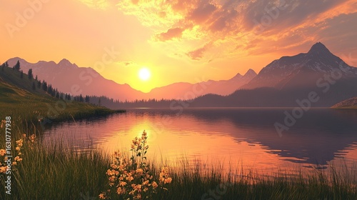 A serene sunset casts warm hues over a tranquil lake, surrounded by majestic mountains and lush greenery, creating a peaceful natural landscape.