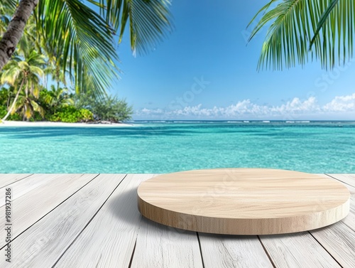 A serene tropical beach scene featuring a wooden platform overlooking crystal clear water and lush palm trees.