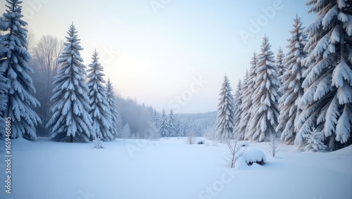A serene winter landscape showcases snow-laden evergreen trees in a tranquil setting, bathed in soft light.