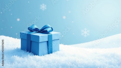 A Serene Winter Scene Featuring a Light Blue Gift Box with a Matching Bow, Resting on a Snowy Landscape Under a Soft Blue Sky
