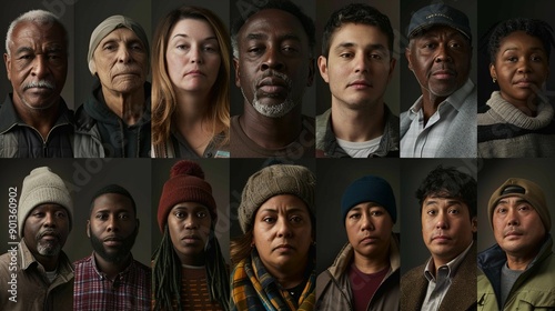 A series of portraits of individuals from various backgrounds, each sharing a personal story of overcoming economic hardship, emphasizing diversity and unity