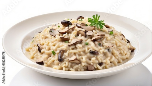 A serving of Italian risotto with mushrooms and Parmesan cheese, creamy texture, elegantly plated, isolated on white background
