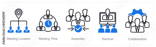 A set of 5 Meeting icons as meeting location, meeting time, assembly