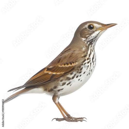 a side view of a bird with a brown and white plumage. featuring distinct spots on its chest and a slender beak the bird stands upright against a plain background. highlighting its features and colors