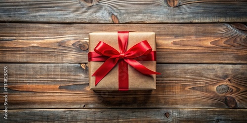 A Simple Gift Wrapped in Kraft Paper and Tied with a Red Satin Ribbon, Placed on a Rustic Wooden Surface